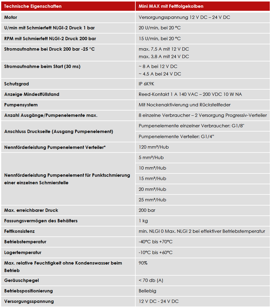 Die Pumpe ist für Fettklassen bis max. (und einschließlich) NLGI 2 ausgelegt. Die Elektropumpe Mini MAX ist vollkommen von der Außenumgebung geschützt und kann auch